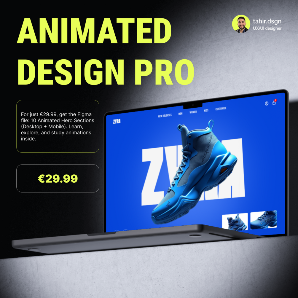 Unlock your creativity with Animated Designs Pro | Hero UI/UX Templates a premium Figma file featuring 10 fully animated Hero sections, crafted for both desktop and mobile for just €29.99. These hero sections span various industries and showcase diverse animation styles to make your projects stand out instantly.